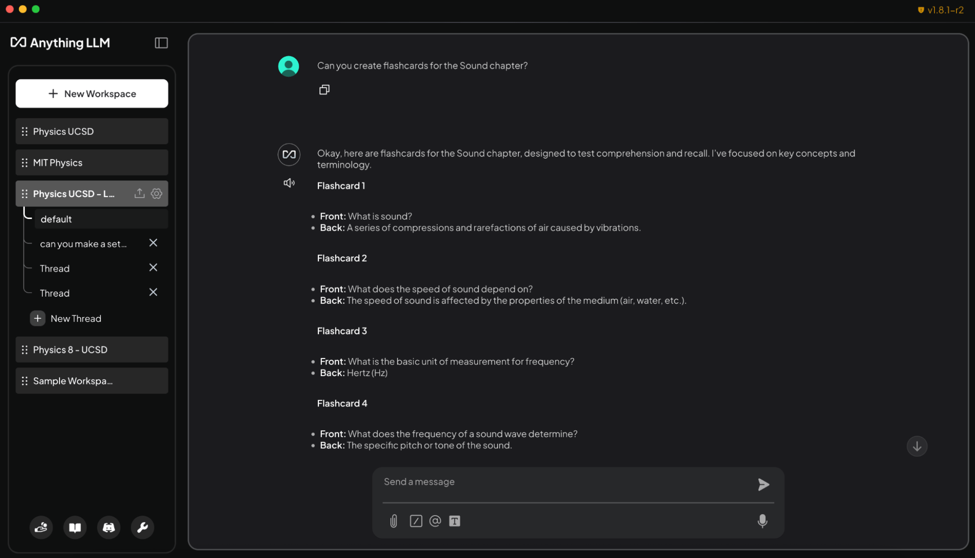 - Generating flashcards from lecture slides: “Create flashcards from the Sound chapter lecture slides. Put key terms on one side and definitions on the other.”